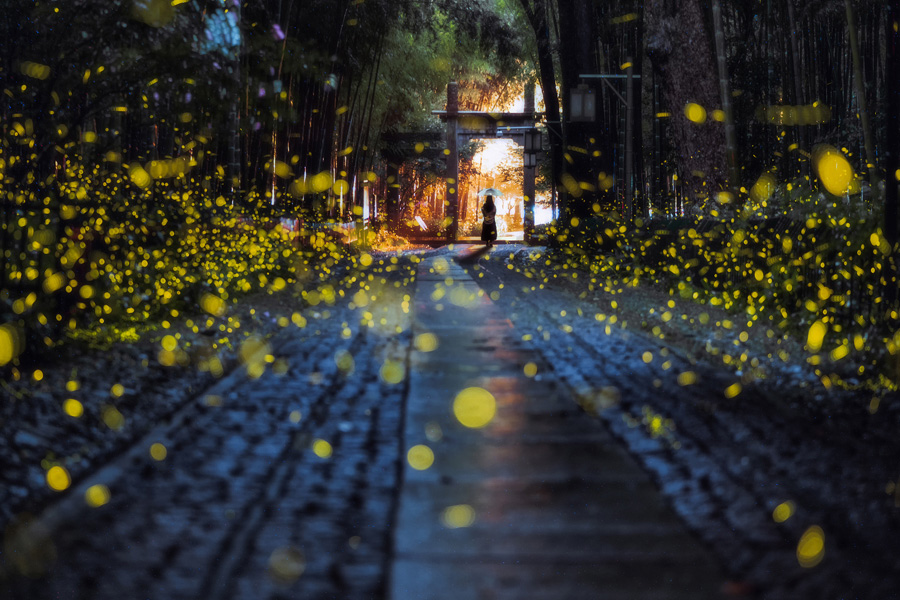 浙江省杭州市の雲(yún)棲竹徑。入口までの長い石畳で美しい光を放つ無數(shù)のホタル(寫真著作権はCFP視覚中國が所有のため転載禁止)。
