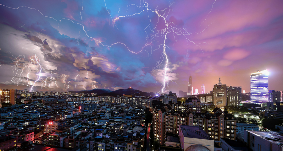 広東省東莞市の空に走った稲妻(寫真著作権はCFP視覚中國が所有のため転載禁止)。