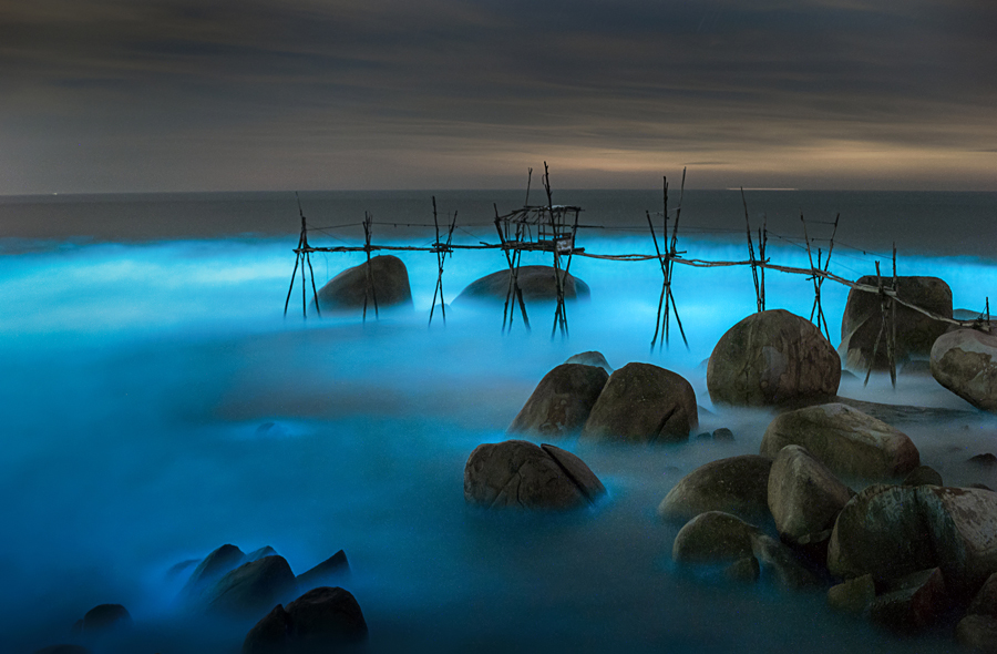 福建省漳浦県六鰲鎮(zhèn)抽象畫廊の海岸一面に現(xiàn)れた「青い涙」と呼ばれているウミホタル(寫真著作権はCFP視覚中國が所有のため転載禁止)。