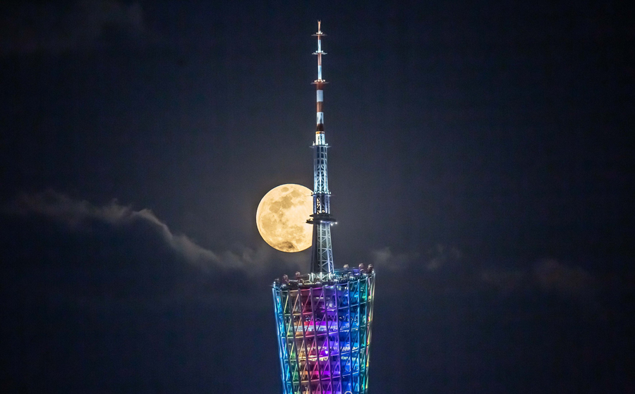 広東省広州市の空に現(xiàn)れた2020年最後のスーパームーン。広州タワーと互いに引き立て合っている(寫真著作権はCFP視覚中國が所有のため転載禁止)。