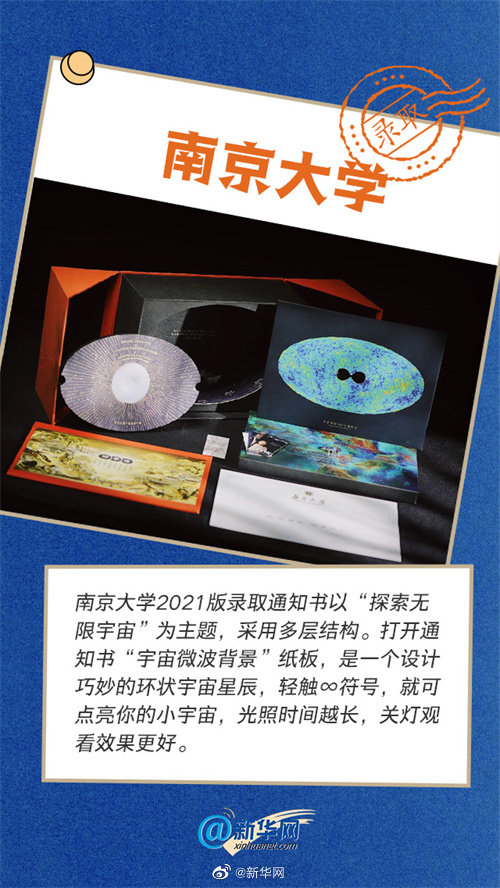 南京大學(xué)2021年度版合格通知書(shū)のテーマは「無(wú)限の宇宙を探求」で、多層構(gòu)造を採(cǎi)用。厚紙で作られた表紙「宇宙のマイクロ波背景」を開(kāi)くと、巧妙にデザインされた環(huán)狀の宇宙の星が登場(chǎng)し、「∞」のマークをタッチすると、小宇宙が點(diǎn)滅し、點(diǎn)燈時(shí)間が長(zhǎng)ければ長(zhǎng)いほど、明かりを消した時(shí)の視覚効果が素晴らしくなるという。