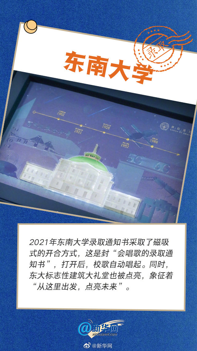 2021年度版東南大學(xué)合格通知書(shū)は、マグネット式オープンスタイルで、「歌を歌う合格通知書(shū)」だ。開(kāi)くと、同校の校歌が自動(dòng)的に流れる。同時(shí)に、同校のランドマーク的存在である大講堂が點(diǎn)滅し、「ここから出発し、未來(lái)を明るく燈す」ことを象徴。
