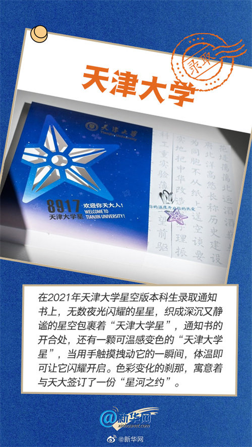 2021年の天津大學(xué)の星空版學(xué)部生合格通知書(shū)は、通知書(shū)を開(kāi)閉する場(chǎng)所に、溫度によって色が変わる「天津大學(xué)の星」があしらわれており、その星を手でそっと觸れて軽く引っぱると、體溫を感じたセンサーによって通知書(shū)が華々しく開(kāi)くデザインになっている。