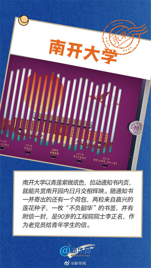 天津市にある南開(kāi)大學(xué)は6月23日、中國(guó)共産黨創(chuàng)立100周年を祝う特別バージョンの合格通知書(shū)を公開(kāi)した。通知書(shū)と同封された小さな袋には、浙江省嘉興市産のハスの種子2粒が入っている。このほか、「不負(fù)韶華(時(shí)間を無(wú)駄にせず、日々を大切に生きる)」と書(shū)かれたしおり、中國(guó)工程院院士で同校OB、古くからの共産黨黨員である李正名氏(90)が若い學(xué)生たちに寄せた手紙も同封されており、強(qiáng)國(guó)時(shí)代のバトンを彼らが引き継いでくれるよう激勵(lì)している。