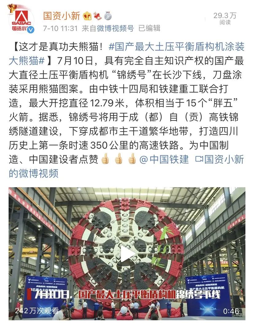 最近、「大國の代表的な製品がパンダ模様に」の話題がネットの検索ランキングを賑わしている。最大の國産土圧バランスシールドマシン「錦繍號」がこのほど、パンダの模様の塗裝で登場した。