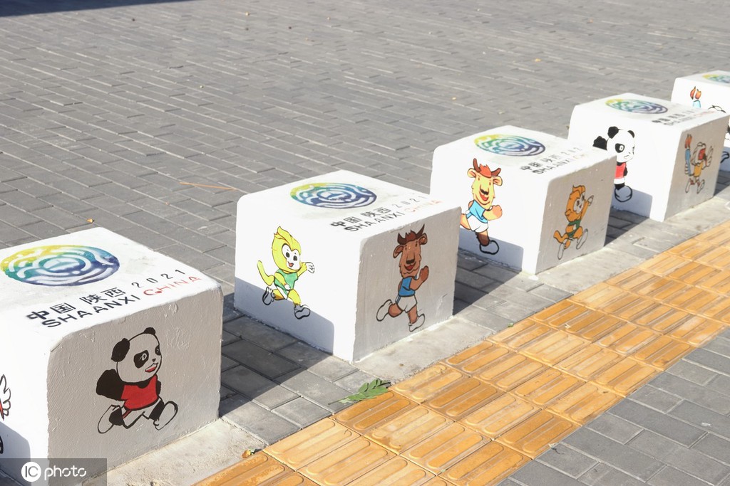 7月13日、陝西省西安市の街頭で、並んだ石製スツールの上に、「第14回全國(guó)運(yùn)動(dòng)會(huì)」のマスコットデザインがお目見(jiàn)え(寫(xiě)真著作権は東方ICが所有のため転載禁止)。