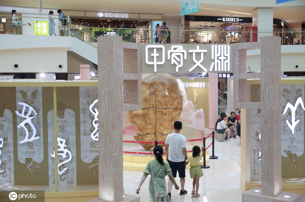 7月21日、多くの市民が詰めかけた陝西省西安の南郊外にある商業(yè)施設(shè)で開かれている「國家図書館収蔵甲骨文字クリエイティブ展」(寫真著作権は東方ICが所有のため転載禁止)。