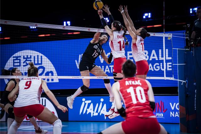 6月2日、FIVBバレーボールネーションズリーグ2021の予選ラウンド第6戦でトルコと対戦した際、アタックを打つ中國の劉晏含選手(寫真左上、寫真ソース?新華社)。
