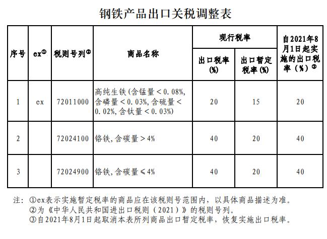 鉄鋼産業(yè)のモデル転換?高度化と質(zhì)の高い発展を促進(jìn)するために、國務(wù)院の承認(rèn)を経て、國務(wù)院関稅稅則委員會(huì)は公告を発表し、2021年8月1日より、クロム鉄と純度の高い銑鉄の輸出関稅を適宜引き上げ、調(diào)整後の輸出関稅率はクロム鉄が40%、純度の高い銑鉄が20%となることを明らかにした。(編集KS)