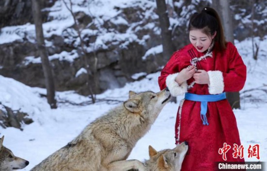 オオカミパークでオオカミと觸れ合う楊さん(寫真提供?楊さん)。