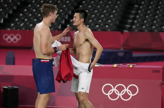 試合後、アクセルセン選手がユニフォームの交換を提案すると、諶選手も承諾した。ライバル同士、敬意を表した形だ。