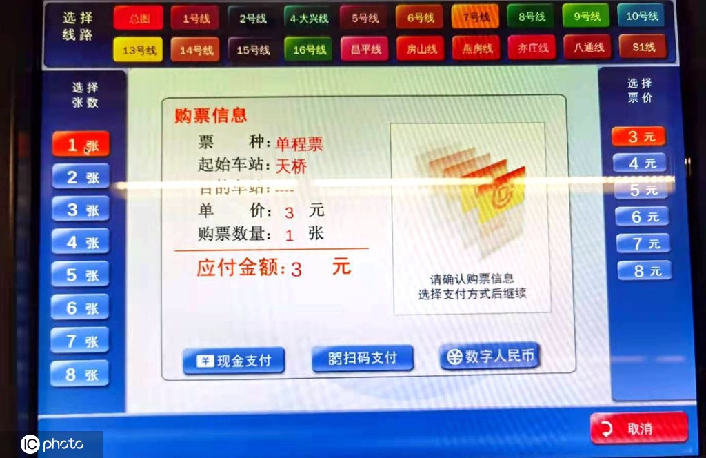 北京の地下鉄では8月1日より、新たにデジタル人民元によるオフラインの切符?カード購入、切符の不足額精算、カードチャージ機能と、「億通行」アプリによるオンライン切符購入などのシーンの応用に対応し始めた。自動券売機の切符購入畫面では、デジタル人民元の選択肢が各種支払い方法の最上位に表示される。目的地の駅及び購入枚數(shù)の選択後、畫面には「支払いコードをスキャンして下さい」というメッセージが表示され、瞬時にして切符購入が完了。支払い全體の操作は簡単で、スキャンするだけで完了し、畫面表示がもたつくことは一度もなかった。(編集YF)