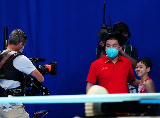 8月5日、演技後の全紅嬋選手(寫真前列右)と劉犇コーチ(寫真前列中央、撮影?許暢)。