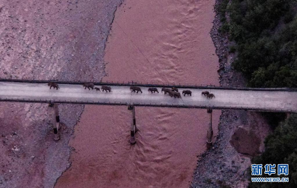 舊國道213號線の元江橋を渡るゾウの群れ(8月8日にドローンで撮影、畫像は新華社から)。