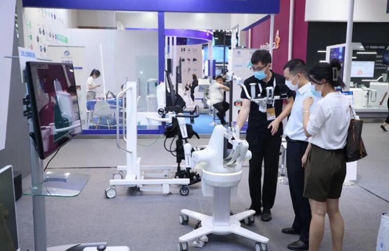 2021年7月11日、上海で開(kāi)催された2021年世界AI大會(huì)の會(huì)場(chǎng)で、上海傅利葉智能科技有限公司のスタッフがリハビリロボットを紹介する様子。(寫真提供は浦東新區(qū)の公式微博<ウェイボー>)