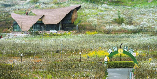 四川省彭州市熙玉村には約66.66ヘクタールのナシ園があり、ナシの花の香りがほのかに漂っている。そんなナシ園の真ん中には人目を引く図書(shū)館がある。三階建てのガラス張りで、屋根は木製でログハウスのような雰囲気。農(nóng)村の素樸な雰囲気にマッチしながら、近代的なデザインにもなっている。