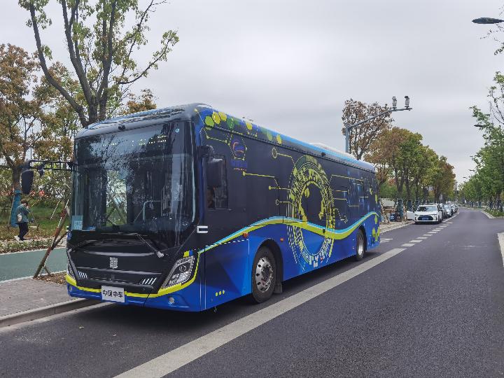 上?!腑h(huán)湖一路スマート路線バス」の運営テストが2021年4月22日、公道で行われた。(畫像は取材先が提供)