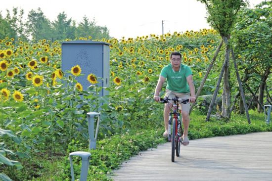 ヒマワリ畑が広がる公園でサイクリングする男性(撮影?李明成)。