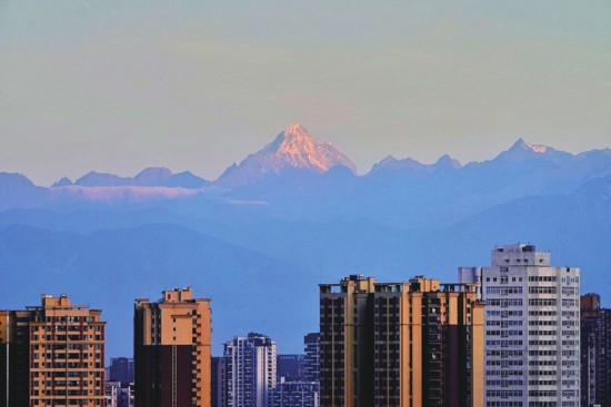 冠雪した雄大な山の下にある都市?成都(撮影?李泉鶴)。