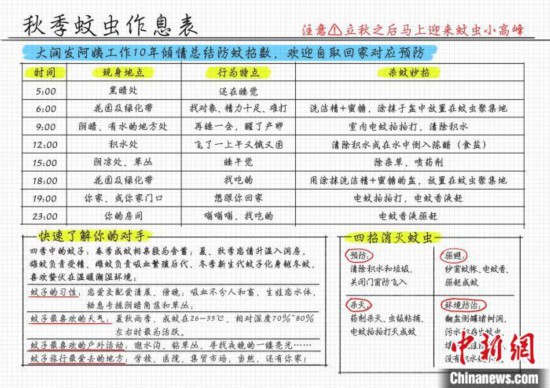 上海市のあるスーパーで有害生物防除専門員として働く浦賽紅さんは最近、利用客に無料で手作りの「蚊の行動(dòng)表」を配布している。これは秋の蚊の対策に用いるものだ。この行動(dòng)表には蚊の24時(shí)間の出現(xiàn)場(chǎng)所、行動(dòng)の特徴、各時(shí)間帯の駆除のコツが詳細(xì)に記されている。また蚊の習(xí)性、好む天気、好む屋外活動(dòng)、最も好きな場(chǎng)所や、予防?回避?駆除?環(huán)境防除の方法が詳細(xì)に記されている。中國(guó)新聞網(wǎng)が伝えた。