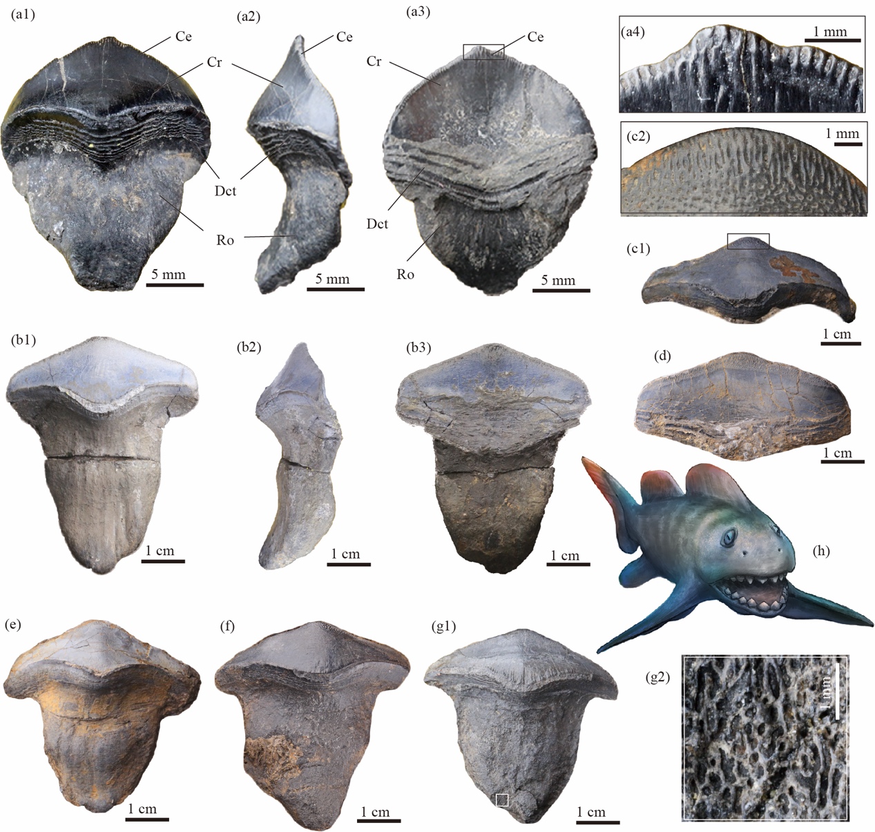 山西陽(yáng)泉太原組銭石灰?guī)r內(nèi)の紀(jì)元前の巨大ザメ、瓣歯サメの歯の化石(蓋志琨撮影、楊定華復(fù)元図作成)