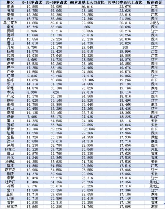 省別に見(jiàn)ると、149都市は22省に分布し、そのうち7省は「高齢社會(huì)」に突入している都市が10都市以上ある。最も多いのは四川省で17都市だ。その主な原因は、四川省の地級(jí)市?州の數(shù)が多く、地級(jí)市の人口の多くは、沿海の発展した地域に流れる傾向にあることだ。近年、省都である成都市の経済は急速に発展しており、大量の人口が成都に流入している。