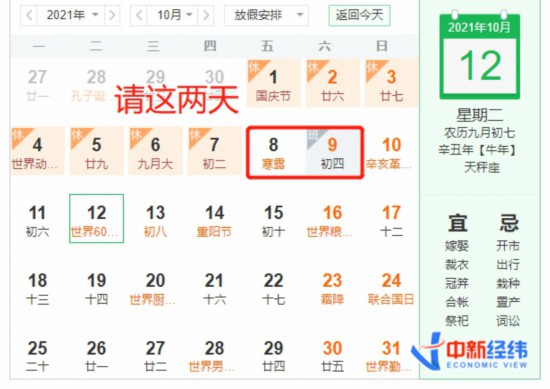 10月8日と9日に休暇を取った場(chǎng)合、10月10日(日曜日)と繋げれば、10連休になる。