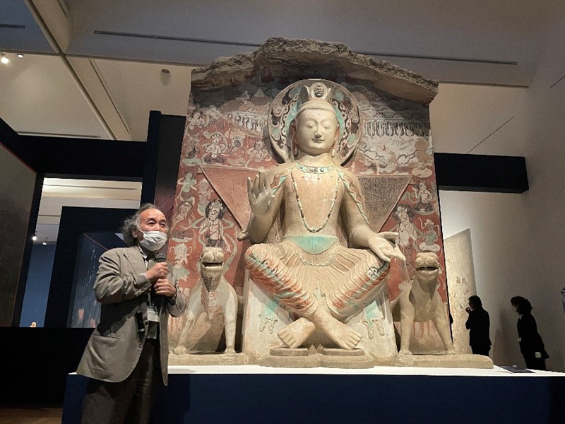 莫高窟第275窟の交腳彌勒菩薩像について説明する東京蕓術大學の宮廻正明名譽教授。実際の莫高窟の第275號窟では破損している交腳彌勒菩薩像の左手と右手の部分が東京蕓術大學のスーパークローン文化財の技術で復元されている(撮影?呉穎)。