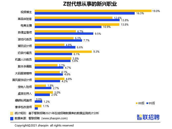 同報(bào)告によると、Z世代にはおいしいもの好きのグルメ、暮らしを記録することの好きな文蕓青年がたくさんいる?!?5後」の16.3%と「00後」の19%がビデオブロガーになりたいと思い、他の職業(yè)を選ぶ割合を上回る。また「95後」の13.8%と「00後」の12.6%が「料理の味見(jiàn)係」になりたいと考えている。