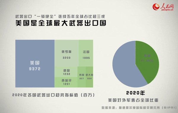 米國は戦爭を「輸出」するだけでなく、代理戦爭の支援、國內(nèi)反亂の煽動、暗殺、武器弾薬の供給、反政府武裝勢力の訓(xùn)練など、直接的または間接的に公然と他國に干渉し、自國の軍産利権集団の金儲けに便宜を図ってきた。米ブラウン大學(xué)が9月13日に発表した研究報告によると、2001年以降の米國の軍事費合計14兆ドル以上のうち、半分近くが米國の軍需企業(yè)に流れていた。また、SIPRIの統(tǒng)計によると、米國は世界最大の武器輸出國であり、2010年から2020年までの米國の対外武器売卻額は世界の武器売卻総額の約3分の1を占める。