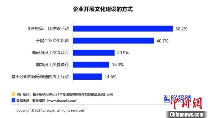 さまざまな企業(yè)の文化活動の中で、最も多いのは交流とチームビルディングだ。50.2%が「自分の働いている企業(yè)が交流?チームビルディングを行ったことがある」とした。次は「文化研修、上層部との腹を割った話し合い、社員の福利厚生の充実など」だった?!钙髽I(yè)內(nèi)ネットワークなどのルートでオンライン交流が行われた」とした人は14.6%にとどまった。