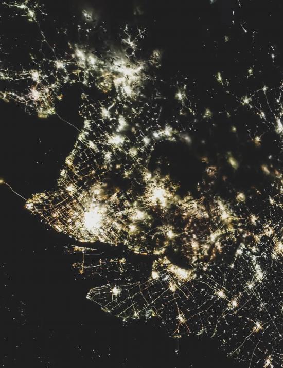 浙江省の杭州灣と銭塘江では、毎年発生する海から川へと潮の流れが逆流する海嘯(かいしょう)の音が聞こえるかのようで、海へと流れる長江がある夜の上海を宇宙から見ると、まさにきらめく珠玉のようだ。