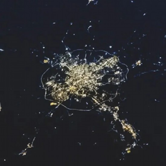 夕日の最後の光が大気層を照らし、さん然と輝く光の帯ができている。光の帯の上には果てしない宇宙が広がり、その下には、光り輝く中國東北エリアの2つの都市が見える。左側(cè)は遼寧省瀋陽市、右側(cè)は吉林省長春市だ。