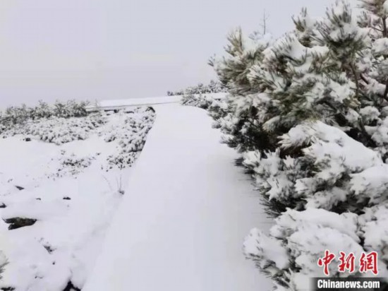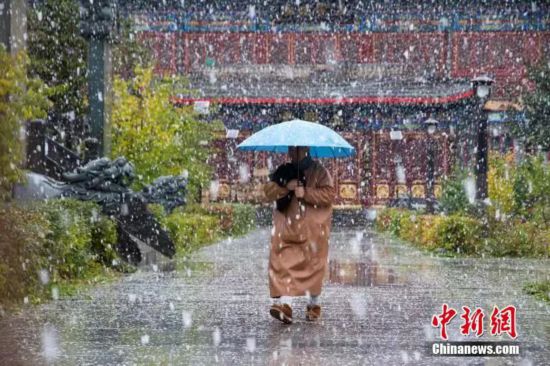 10月5日、気溫が一気に下がり、牡丹雪が降る山西省五臺山(畫像は五臺山竹林寺が提供)。