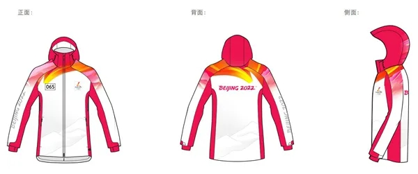 聖火ランナーのユニフォームには、オリンピックシンボル、聖火リレーエンブレム、聖火リレーのイメージ景観デザインなどが描かれている。ユニフォームは、上下スポーツウェア、ニット帽、ヘッドバンド、手袋、スポーツシューズが一セットとなっている。