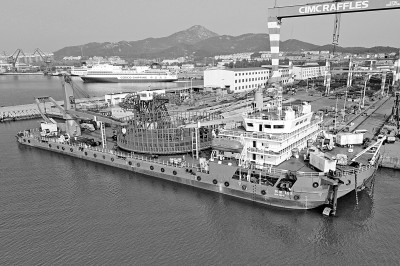 中集來福士の山東省煙臺(tái)市建造拠點(diǎn)で就航を待つ海底ケーブル敷設(shè)船「潤(rùn)能168」(撮影?唐克/光明図片)