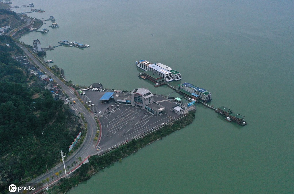 10月27日、湖北省宜昌市秭帰県で、水位上昇後の秭帰港に停泊する船舶(ドローンによる撮影、寫真著作権は東方ICが所有のため転載禁止)。