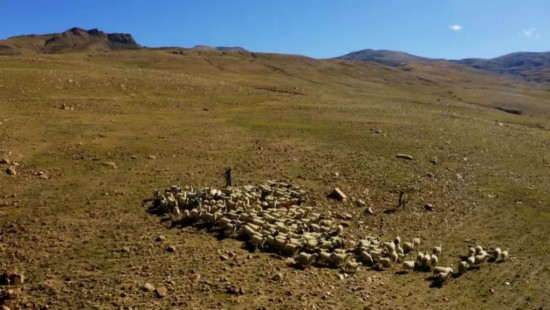 ティンリ県熱拉木村の近くで羊を放牧する牧畜民。