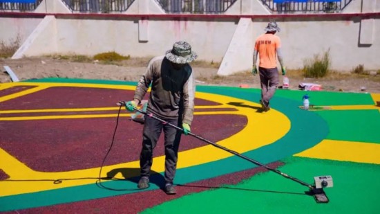 環(huán)境にやさしいバスケットコートを作る作業(yè)員。