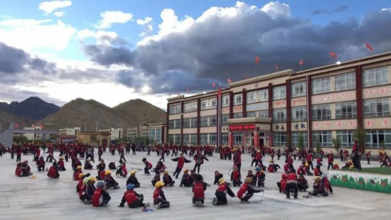 ティンリ県中心小學(xué)校の運(yùn)動場で體育の授業(yè)を受ける學(xué)生たち。