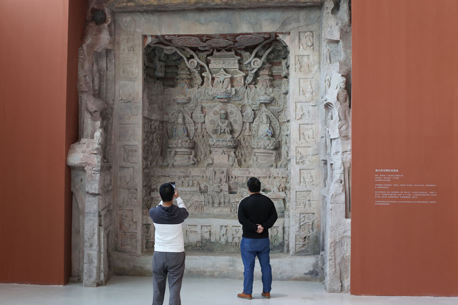 10月30日、重慶市にある四川美術(shù)學(xué)院美術(shù)館で開催されている「盛世修典――『中國(guó)歴代絵畫體系』段階的成果展」會(huì)場(chǎng)で、3Dプリント技術(shù)によって復(fù)元された大足石刻の代表的石窟造像(寫真著作権はCFP視覚中國(guó)が所有のため転載禁止)。