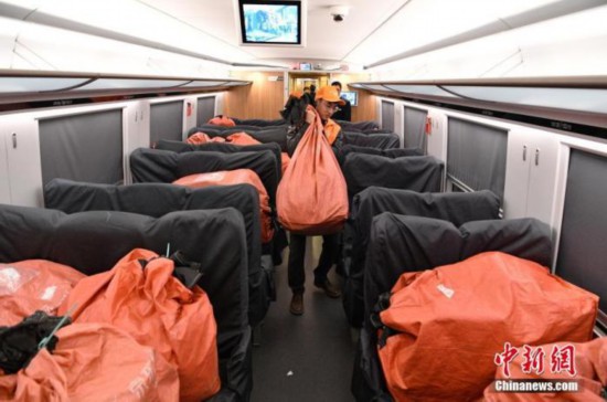 成都から南京に向かう列車に宅配物の入った袋を積み込む作業(yè)員(資料寫真、2019年11月11日撮影?劉忠?。?/p>