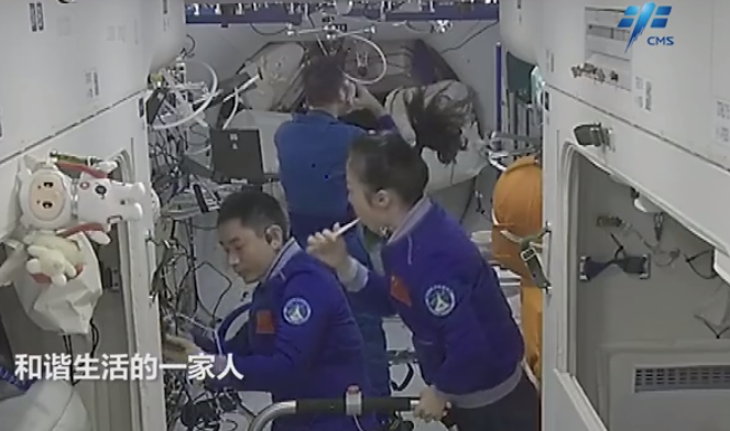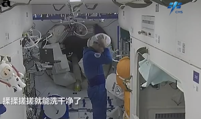 動畫の中で、翟飛行士が最初に起床し、元?dú)轀骸─室蝗栅蜷_始した。つなぎになっている船內(nèi)作業(yè)服を著て、鏡に向かってひげ剃りを終えると、宇宙ステーション専用の水を使わない「シャンプーの神器」であるシャンプーキャップで頭を洗った。