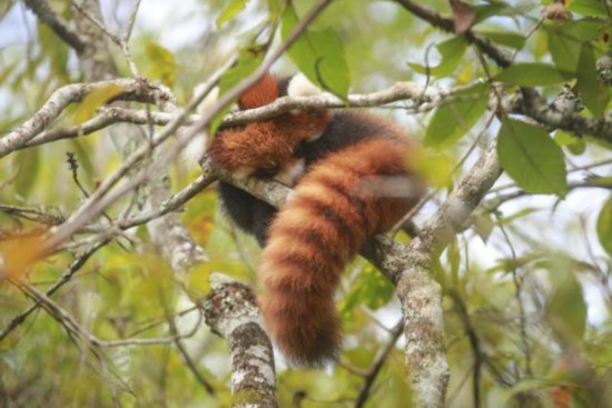 木の上で晝寢するレッサーパンダ(撮影?劉倩)。