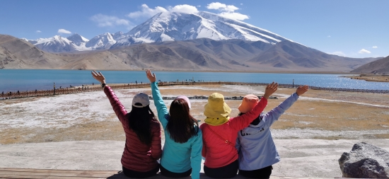 2021年10月3日、新疆維吾爾(ウイグル)自治區(qū)カラクリ湖で記念撮影する観光客ら。(撮影?揚帆)