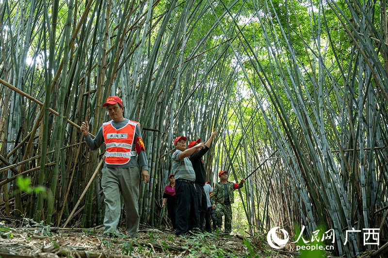 竹林の中をパトロールする野鳥(niǎo)保護(hù)チーム(撮影?厳立政)。