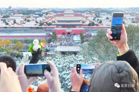北京の景山から雪化粧がほどこされた故宮をスマホで撮影する人々(撮影?鄧偉)。