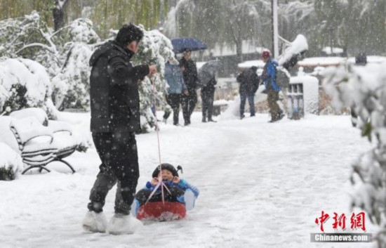 11月7日、山東省済南市大明湖景勝地で雪遊びをする親子(撮影?張勇)。