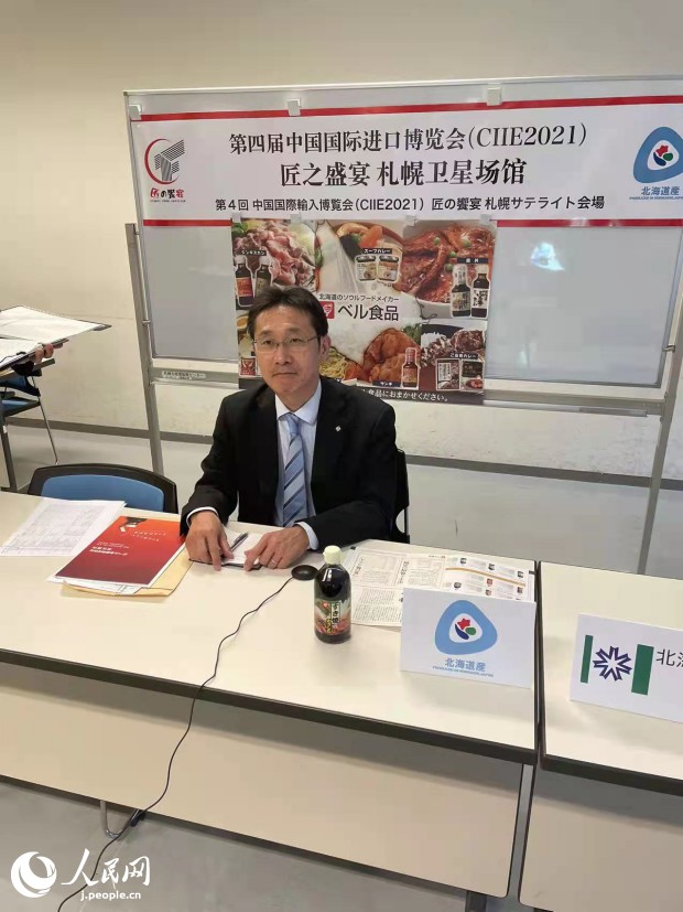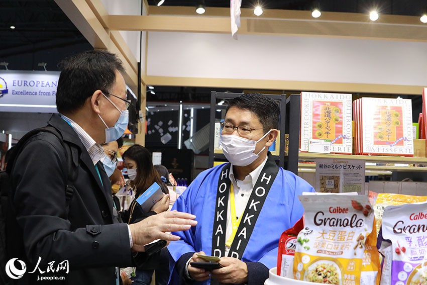 札幌會(huì)場(chǎng)で輸入博の來(lái)場(chǎng)者の聲を聞くベル食品(株)の福島和人課長(zhǎng)代理(寫(xiě)真提供?日中経済協(xié)會(huì)上海事務(wù)所北海道経済交流室)。