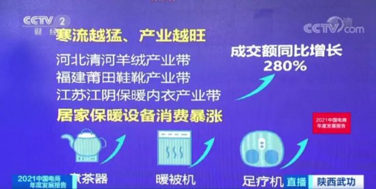 こうした動(dòng)きが関連製品の産業(yè)ベルトにも火を付け、河北省清河県のウール製品、福建省莆田市の靴製品、江蘇省江陰市の保溫インナーなどの産業(yè)ベルトは取引額が前年同期比280%増加し、「寒波が強(qiáng)くなればなるほど、産業(yè)は好調(diào)になる」?fàn)顩rだ。これと同時(shí)に、家の中の暖房設(shè)備の売り上げも大幅に増加。ティーメーカー、布団乾燥機(jī)、フットマッサージャーもおうちライフを暖かく居心地の良いものにしてくれる。(編集KS)